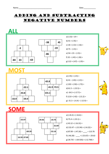 Worksheets for adding negative numbers and subtracting negative numbers.